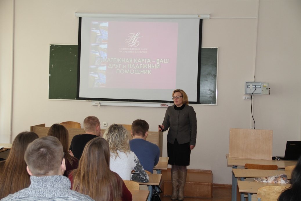 14 марта в нашем университете, в рамках проводимой кафедрой финансов и кредита недели финансовой грамотности — 2016, была организована встреча студентов группы ФК-21 с представителями ведущих банков Гомельской области — заместителем начальника экономического управления Главного управления Национального банка Республики Беларусь по Гомельской области Кожемякиной Натальей Александровной и главным экономистом Дирекции ОАО «Белинвестбанка» по Гомельской области Василенко Игорем Николаевичем. Основное проблемное поле встречи «Платежная карта — Ваш друг и надежный помощник».
