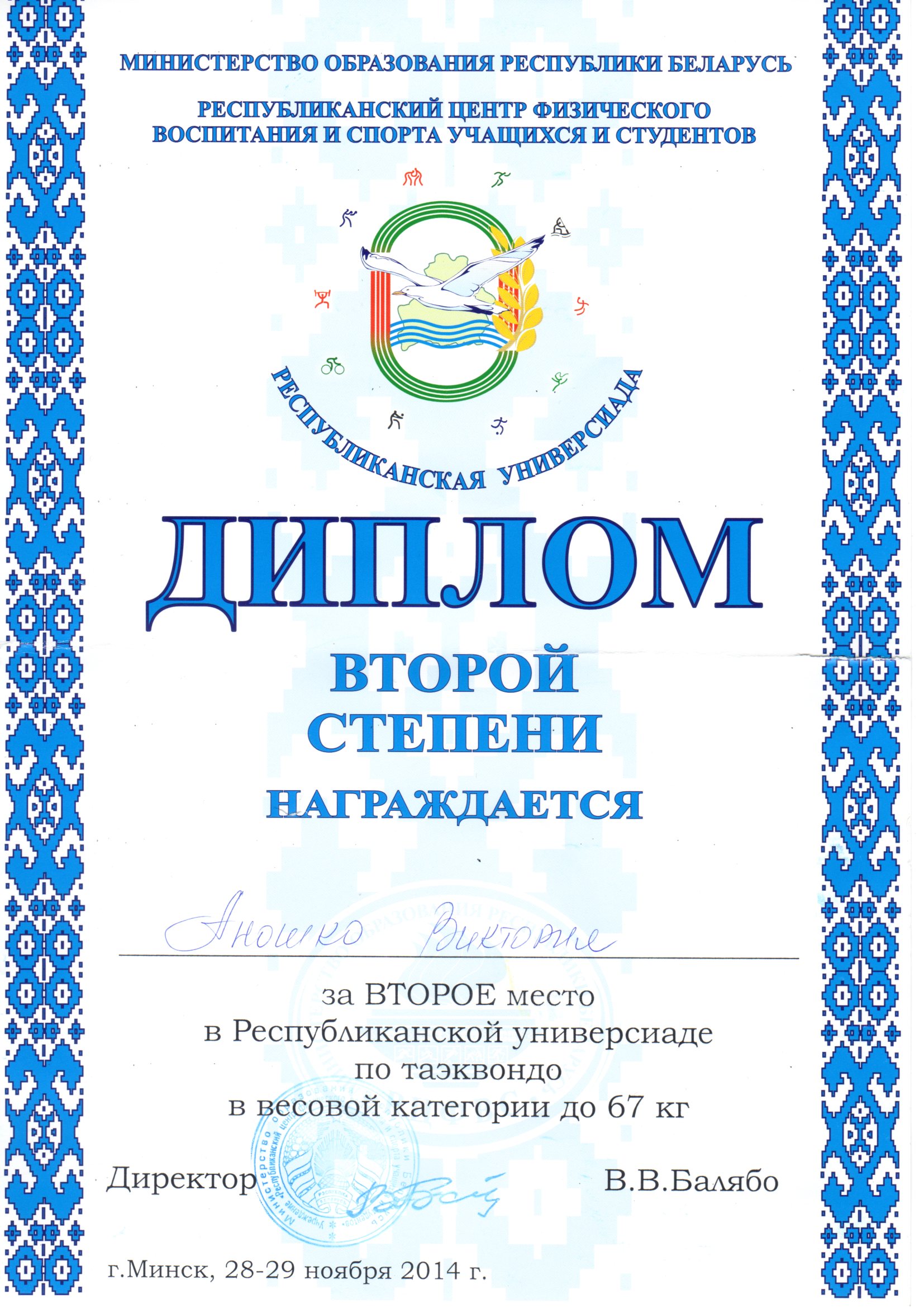 Деканат экономического факультета поздравляет с успешным выступлением на Республиканской универсиаде по таэквондо в весовой категории до 67 кг студентку 4 курса специальности «Государственное управление» Аношко Викторию, которая заняла почетное второе место.
