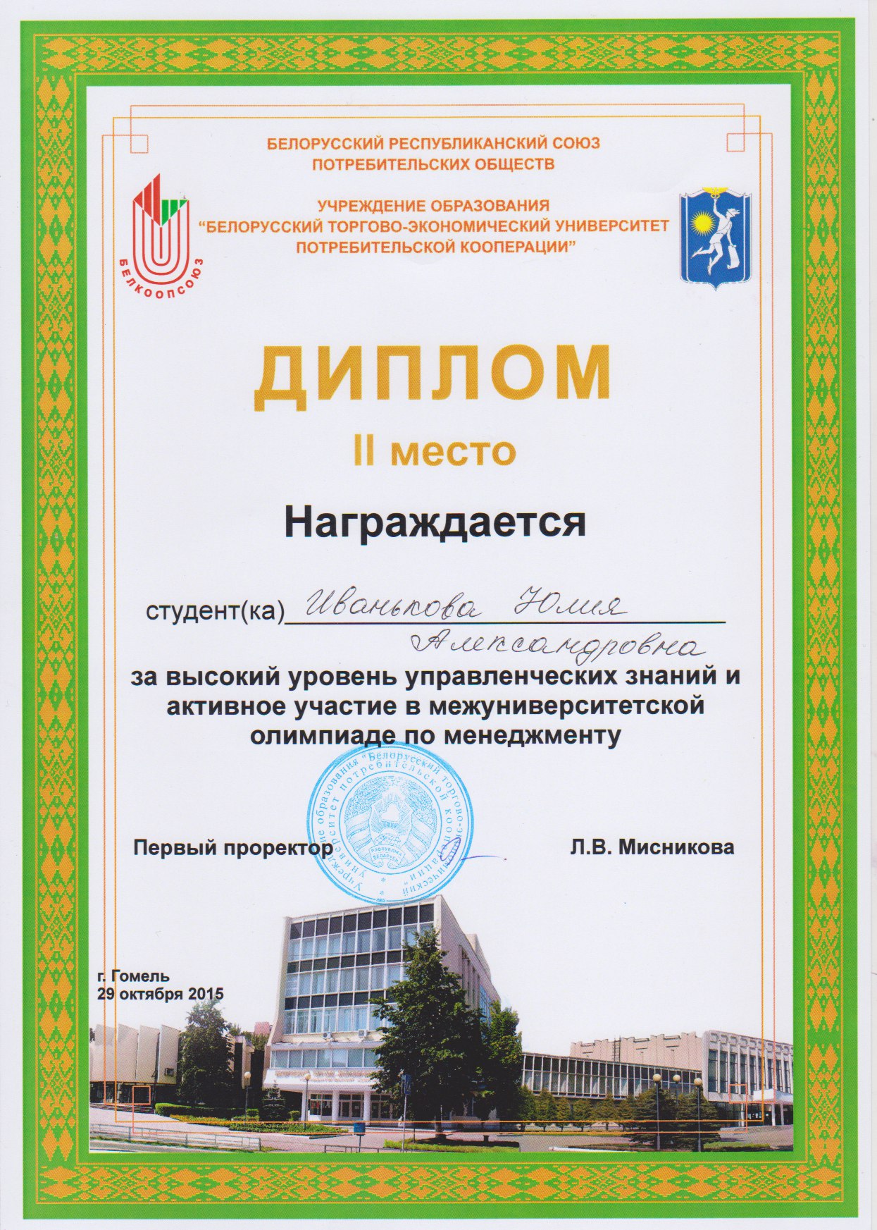 29 октября в Белорусском торгово-экономическом университете потребительской кооперации состоялась межвузовская олимпиада по дисциплине «Менеджмент», в которой приняли участие студенты ведущих вузов города, в том числе и студенты экономического факультета ГГУ им. Ф. Скорины. Студенты нашего факультета второй год подряд показывают высокий уровень подготовки по данной дисциплине. Команда экономического факультета была представлена студентами 4 курса специальности «Государственное управление»: Рубан Юлия, Иванькова Юлия, Митько Мария, Герасименко Ольга.