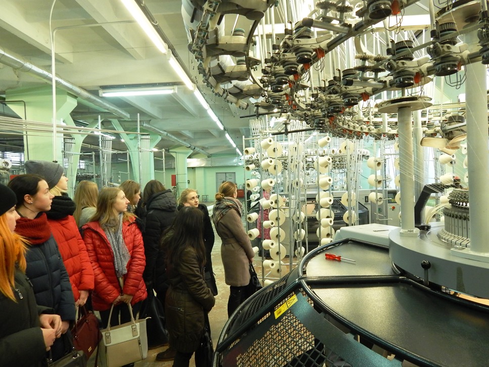 Группу студентов встретила начальник Управления маркетинга и разработки ассортимента С.Я. Дмитриченко. Прослушав краткую историю предприятия и характеристику сегодняшнего этапа его развития, экскурсанты отправились на производственную территорию. Студентов сопровождали инженер-технолог чулочного цеха В.К. Архицкая, художник-дизайнер технологического отдела С.С. Матвеенко, технолог красильного цеха Е.Н. Усова, лаборант по физико-механическим испытаниям Е.А. Орёл.