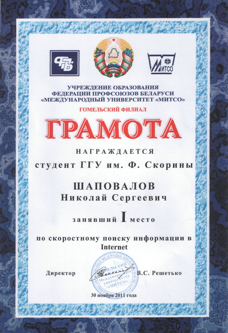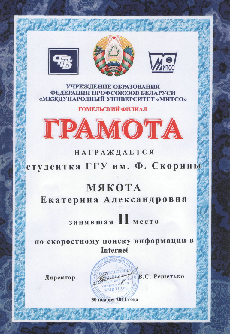 В очередной Межвузовской олимпиаде по скоростному поиску в Internet, проводимой Гомельским филиалом МИТСО 30 ноября 2011 года, участвовало 7 команд из всех ВУЗов г.Гомеля. Призовые места в командном первенстве распределились следующим образом: