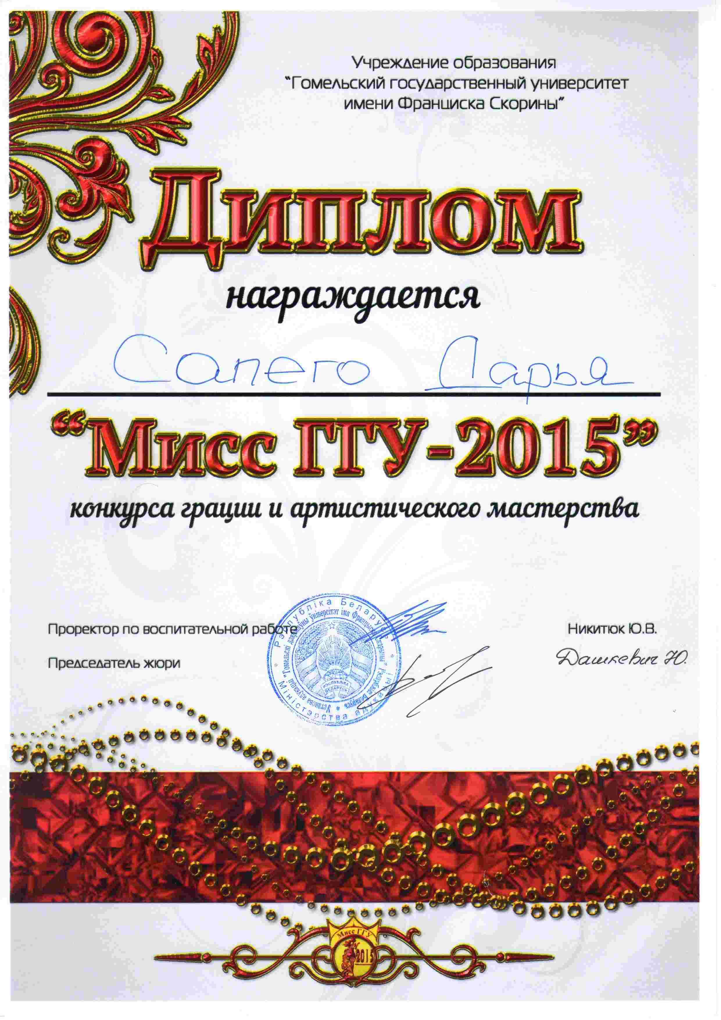 В их числе и две студентки экономического факультета – очаровательные Дарья Сапего и Евгения Толкачева. Представительное жюри, которое оценивало выступление конкурсанток по нескольким номинациям, не смогло устоять перед талантами и блестящим дефиле наших девушек. В итоге Евгения Толкачева стала второй вице-мисс ГГУ им. Ф. Скорины, а Даша Сапего, удостоенная в прошлом году звания первой вице-мисс университета, на этот раз не оставила своим соперницам ни единого шанса. Помимо главного титула – «Мисс ГГУ – 2015» – Даша была лучшей в номинациях «Мисс фото» и «Мисс дружба».