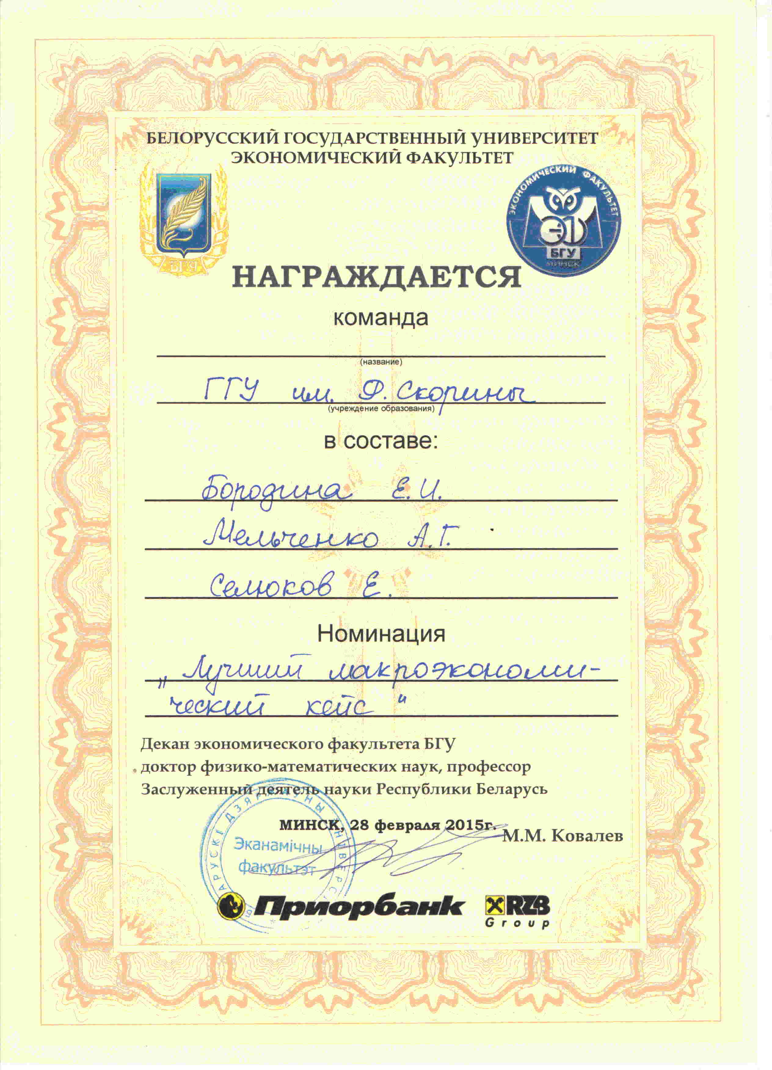 В рамках форума 28 февраля проведена Олимпиада «Аналитическая экономика и эконометрика». По результатам заочного тура Олимпиады к очному туру было допущено 14 из 43 команд. Две сборные команды математического и экономического факультетов студентов ГГУ им. Ф. Скорины ГГУ-1 (А. Мельченко (ЭК-51), Е. Селюков (ЭК-51), Е. Бородина (ФК-31) и ГГУ-2 (А. Галковский (ЭК-51), А. Новиков, (ЭК-51), А. Мищенко (ФК-31)) прошли в очный тур.