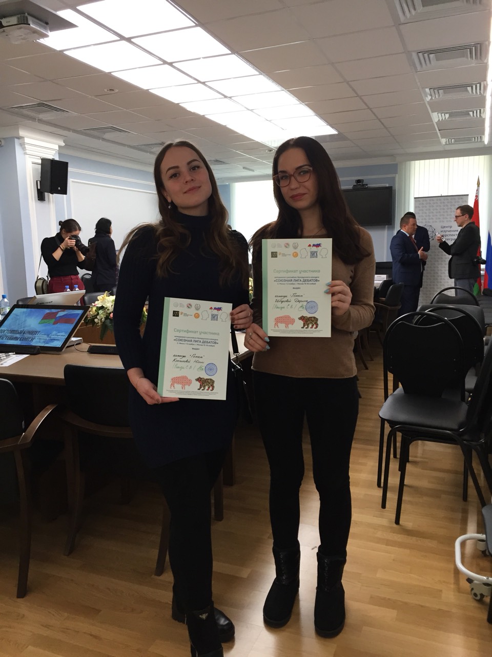 15-16 ноября студентки 4 курса специальности «Экономика и управление на предприятии» Юлия Клепикова и Дарина Шарова приняли участие во втором этапе конкурса «Союзная лига дебатов», который прошел в Московском государственном университете им. М.В. Ломоносова. Напомним, что первый этап состоялся в Белорусском государственном экономическом университете 1-2 ноября 2018 года. На втором этапе студенткам удалось побывать как в качестве открывающего правительства с темой дебатов «В Союзном государстве необходимо создать фонд поддержки гуманитарных проектов и научных исследований», так и в качестве открывающей оппозиции с темой «На территории Союзного государства необходимо ввести единые социальные выплаты». Финал дебатов проходил на площадке Постоянного Комитета Союзного государства, где присутствовал Госсекретарь Союзного государства Григорий Рапота. Победителями конкурса стали студентки Белгородского государственного национального исследовательского университета. Всего в конкурсе приняли участие 24 команды из России и Беларуси. Юлия и Дарина получили сертификат участника, хорошие впечатления и большой опыт участия в переговорном процессе, а также познакомились с достопримечательностями Москвы в рамках организованной обзорной экскурсии.