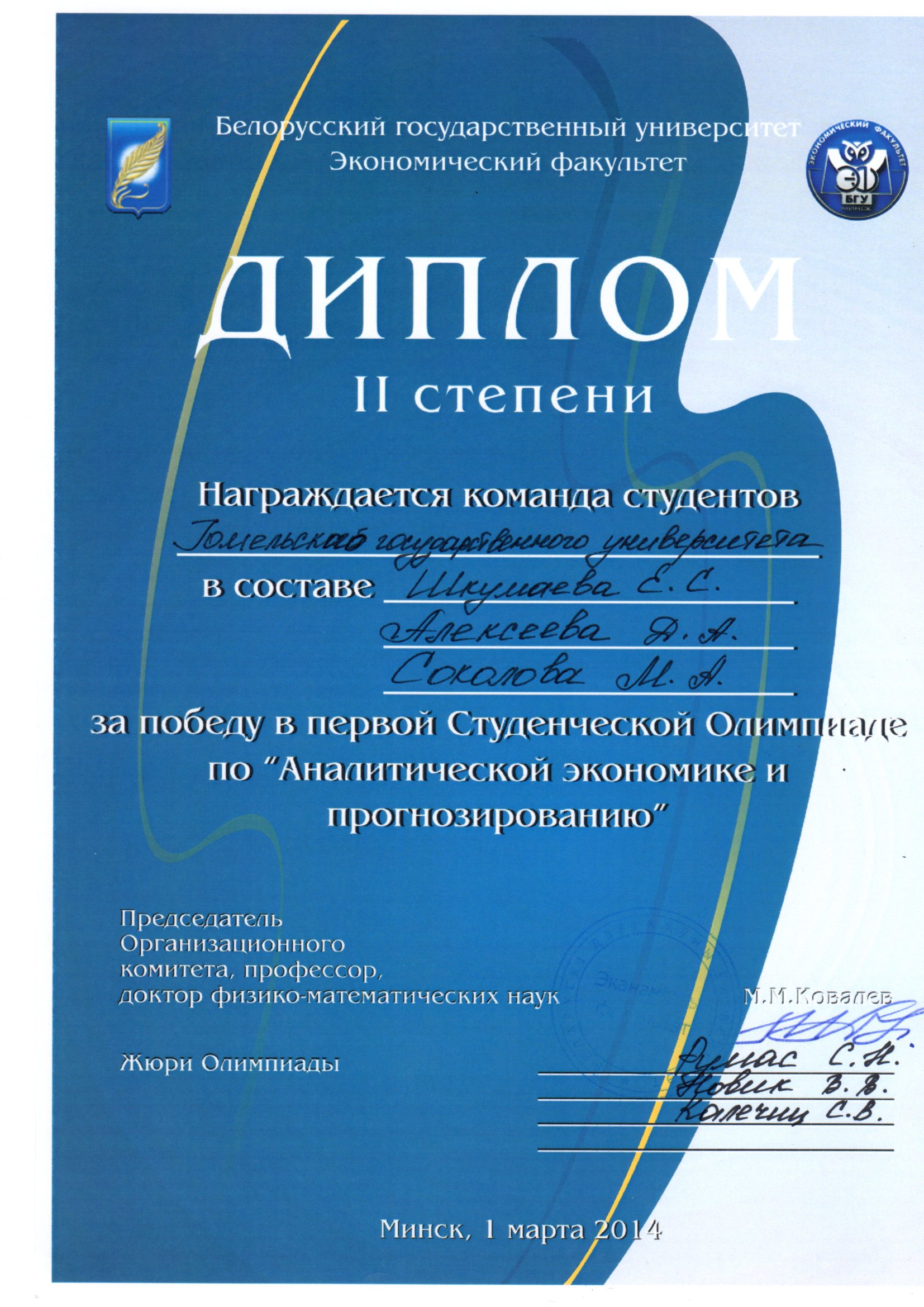 В Белорусском государственном университете 1 марта 2014 года прошел финал Первой студенческой олимпиады по аналитической экономике и прогнозированию, по результатам которого команда студентов Гомельского государственного университета имени Франциска Скорины заняла почетное II место среди ведущих вузов Республики Беларусь.