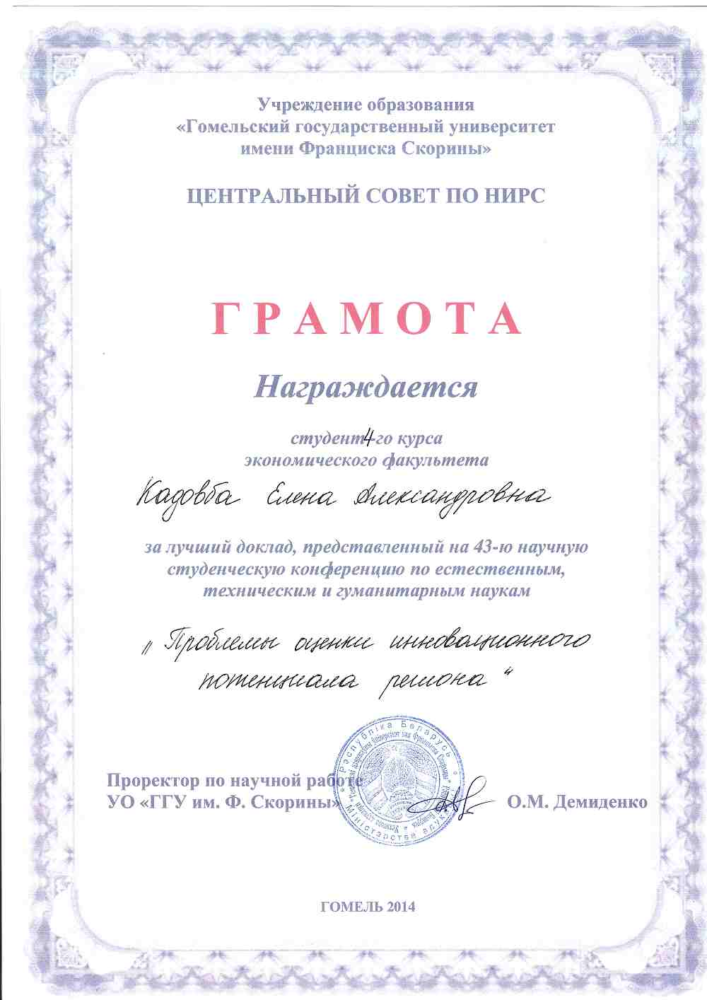 Оргкомитет конференции и центральный совет по научно-исследовательской работе студентов ГГУ имени Ф.Скорины наградил Кадовба Елену грамотой за лучший доклад на тему «Проблемы оценки инновационного потенциала региона».