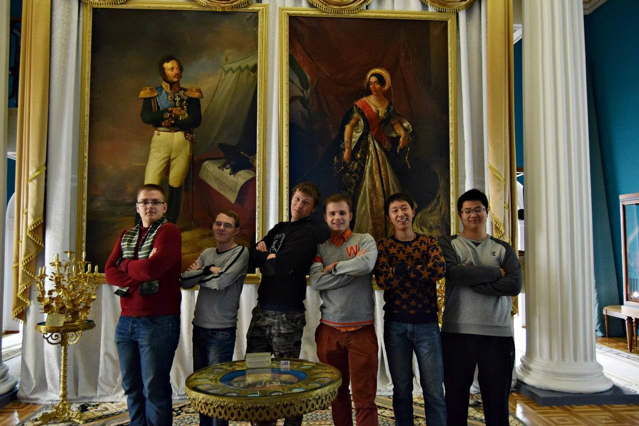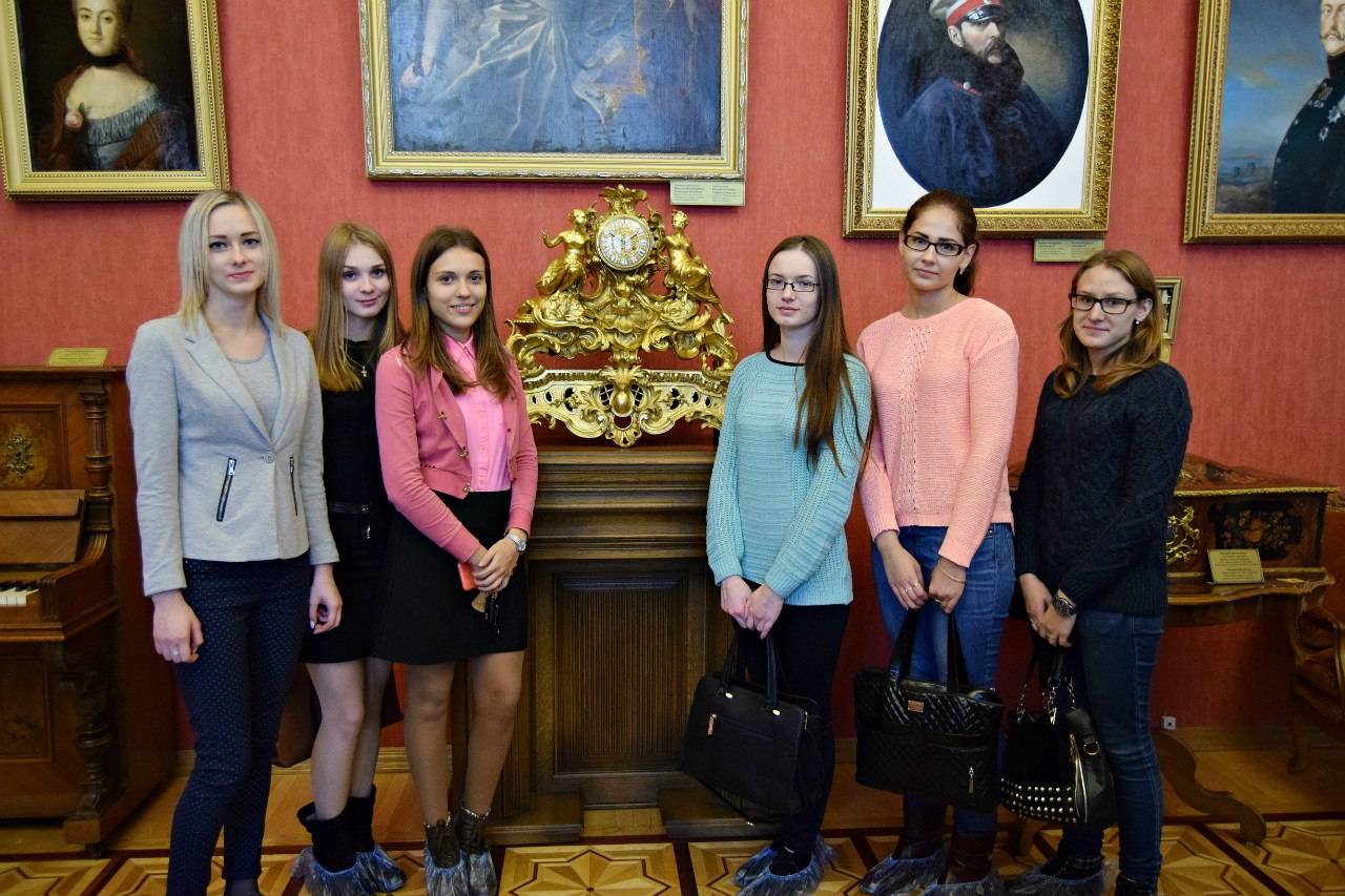 Студенты посетили также и «Аудиенц-зал». Он является реконструкцией интерьера одной из комнат дворца. В экспозиции представлены мраморная скульптура, каминные гарнитуры, картины, фарфоровые статуэтки XVIII-XIX вв. Интерес представляет бронзовый столик с миниатюрными портретами Людовика XVI и придворных дам, мебельный гарнитур, выполненный в первой четверти XIX в., каминный гарнитур, украшенный росписью по фарфору с дарственной надписью: «На память за Езеры-Ушаки от благодарной кн. Е. Оболенской». Центральное место в зале занимают парадные портреты Ивана Федоровича и Елизаветы Алексеевны Паскевичей, выполненные художником XIX в. Шуппе, а также канделябры в форме букетов лилий, подаренные императором Александром II Ф.И. Паскевичу при посещении Гомельского дворца в 1857 г.