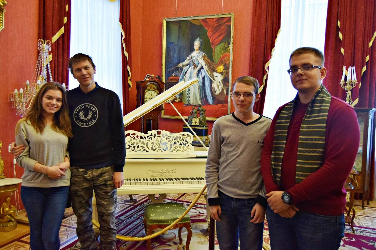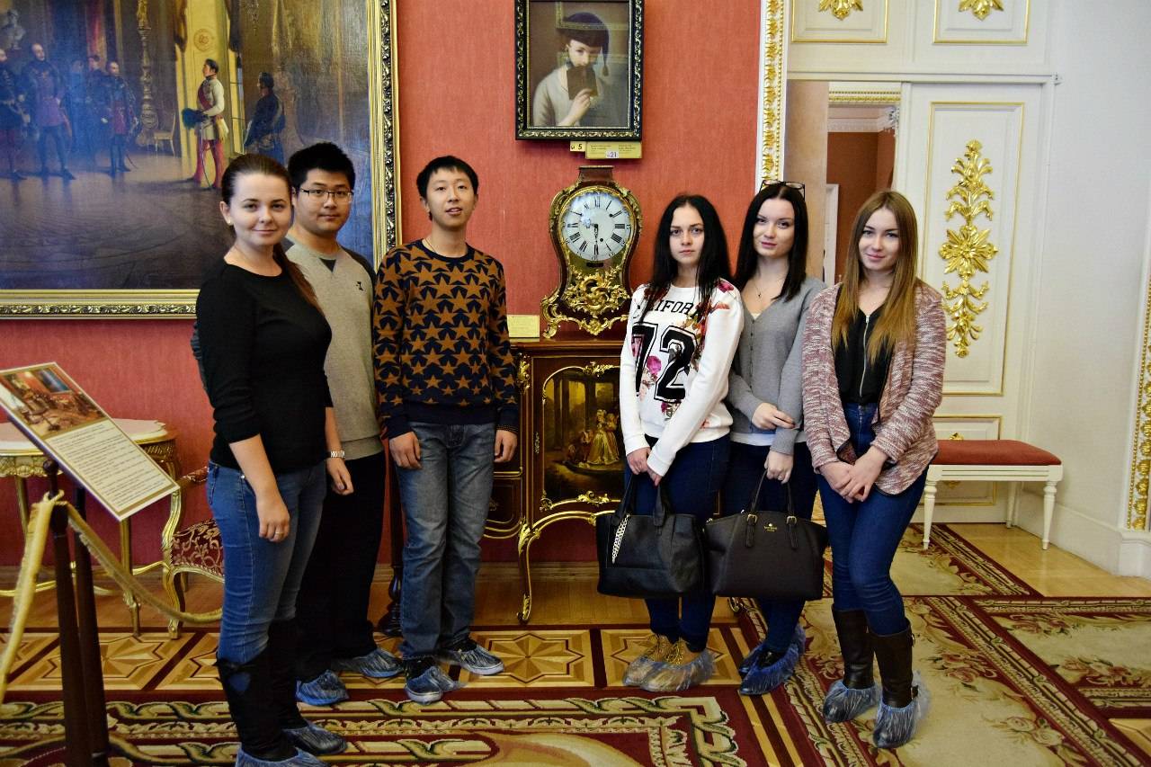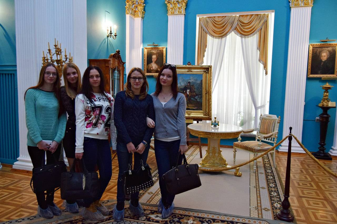 Студенты группы ФК-21 посетили постоянную экспозицию «Красная гостиная» во Дворце Румянцевых и Паскевичей. В середине XIX века она была портретной, а также музыкальным салоном, где наряду с двадцатью портретами находились орган и рояль. Позже красная гостиная превратилась в комнату княгини Ирины Ивановны Паскевич. Рояль и орган были вынесены, комната была разделена на уютные уголки, где можно заниматься различными делами – чтением, вышиванием, играми и просто отдыхать. Диваны и мягкие кресла, лампы под абажурами, мебель из красного дерева, – «всё здесь свидетельствовало» о том, что главным критерием при её размещении было удобство. На стенах висели большие парадные портреты русских царей, а также представителей рода Воронцовых-Дашковых, акварели, гравюры. Здесь же находились часы различных форм и устройств – некоторые из них сохранились до сих пор и находятся в экспозиции музея. Обитатели дворца часы очень любили – разноголосый бой оживлял помещения.