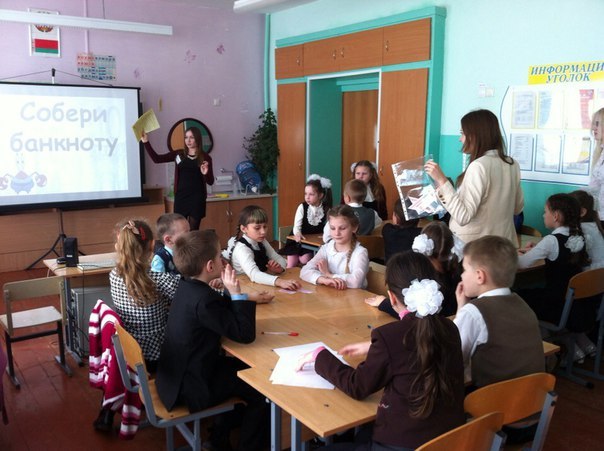 «В советской школе представления о моделях экономических отношений сводились к подсчету яблок у Маши и Пети на уроках математики в младших классах. Но другие времена требуют новых подходов. Учить тонкостям финансовых отношений следует с малых лет. Таким был лейтмотив необычного урока в СШ 29 Гомеля.