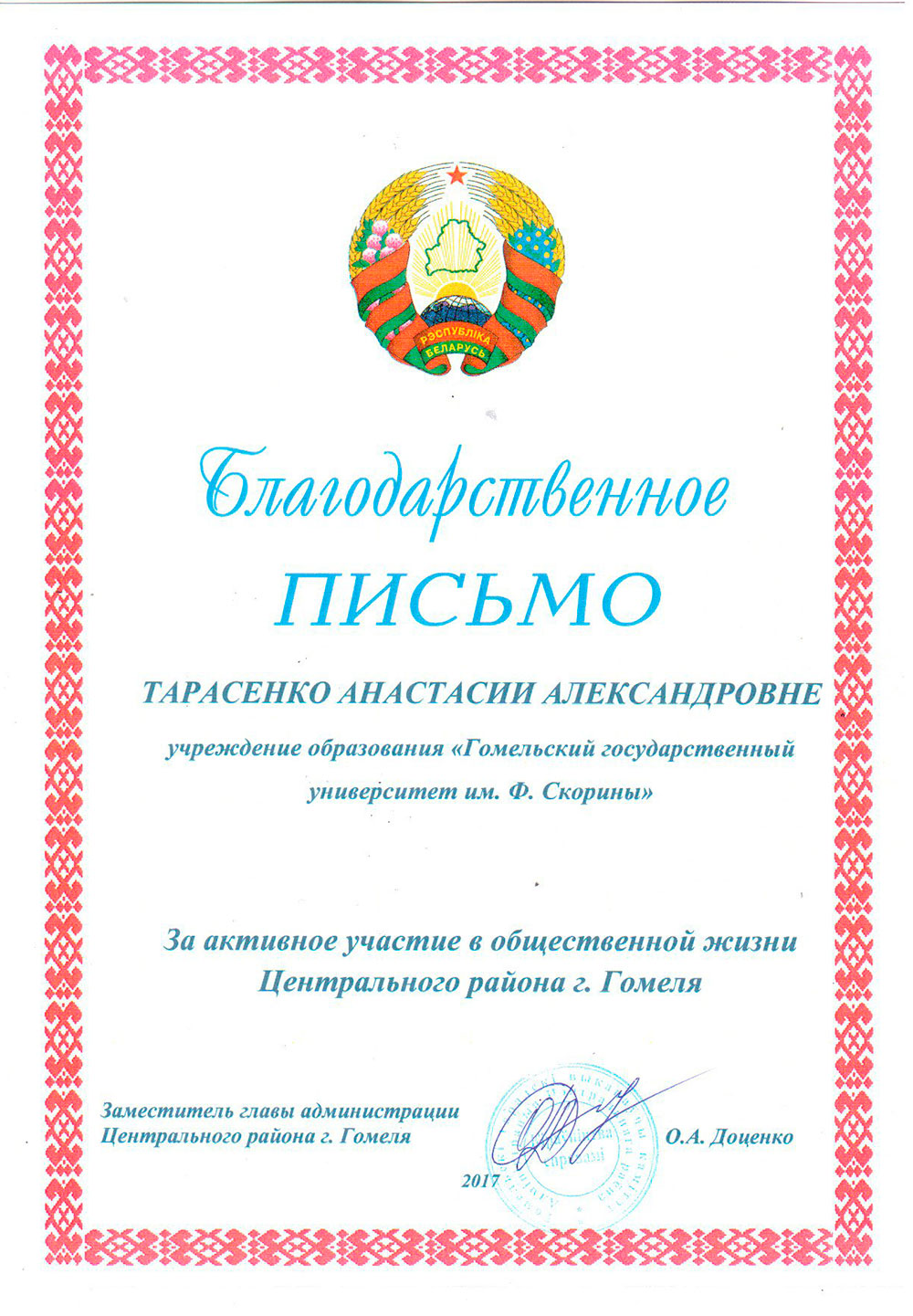 Благодарность за активное участие в общественной жизни района получила староста гр.ФК-31 нашего факультета Анастасия Тарасенко. Её активная жизненная позиция, сострадание к ближним, креативность «зажигают» сердца окружающих людей. И благодаря этому мир вокруг становится лучше!