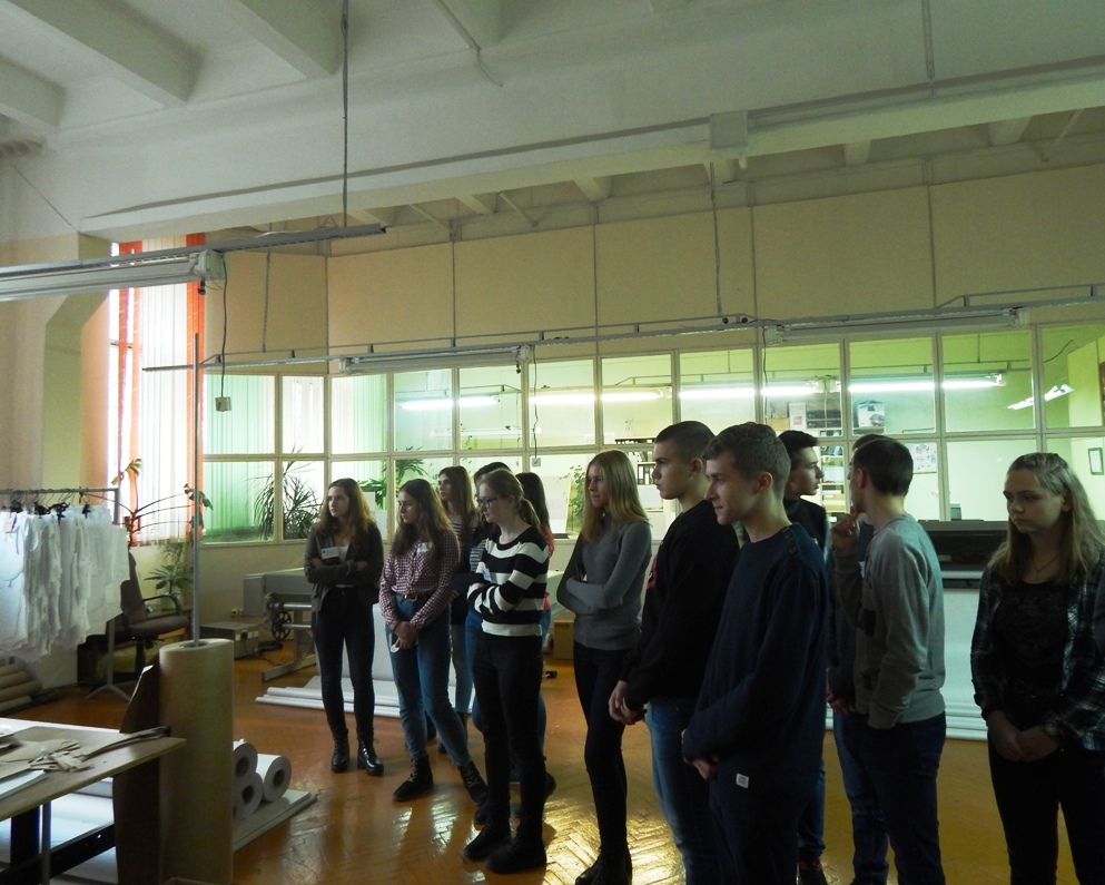 Восемнадцать школьников, в сопровождении учителя ГУО «Гимназия г.п. Корма» Ильи Владимировича Кондратенко и ст. преподавателя кафедры экономики и управления Татьяны Михайловны Шоломицкой, наблюдали за технологическим процессом пошива мужского костюма, ознакомились с особенностями организации производства, узнали о географии продаж (предприятие является экспортёром).