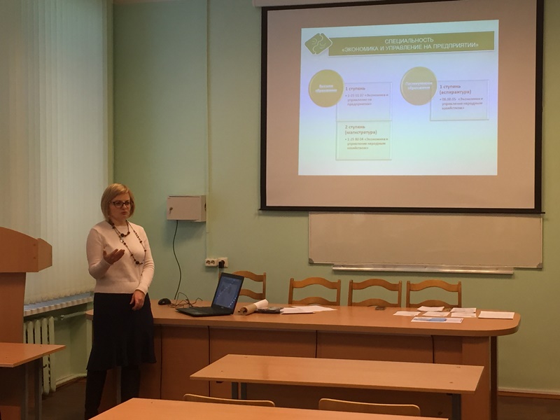 Перед будущими абитуриентами с вступительным словом выступила заведующий кафедрой экономики и управления, к.э.н., доцент Бабына И.В. Инна Владимировна рассказала школьникам об истории и успехах кафедры, познакомила со специальностями «Экономика и управление на предприятии» и «Государственное управление». Также о плюсах и возможностях профессиональной подготовки на нашем факультета рассказала студентка 3 курса специальности «Экономика и управление на предприятии» Клепикова Юлия.