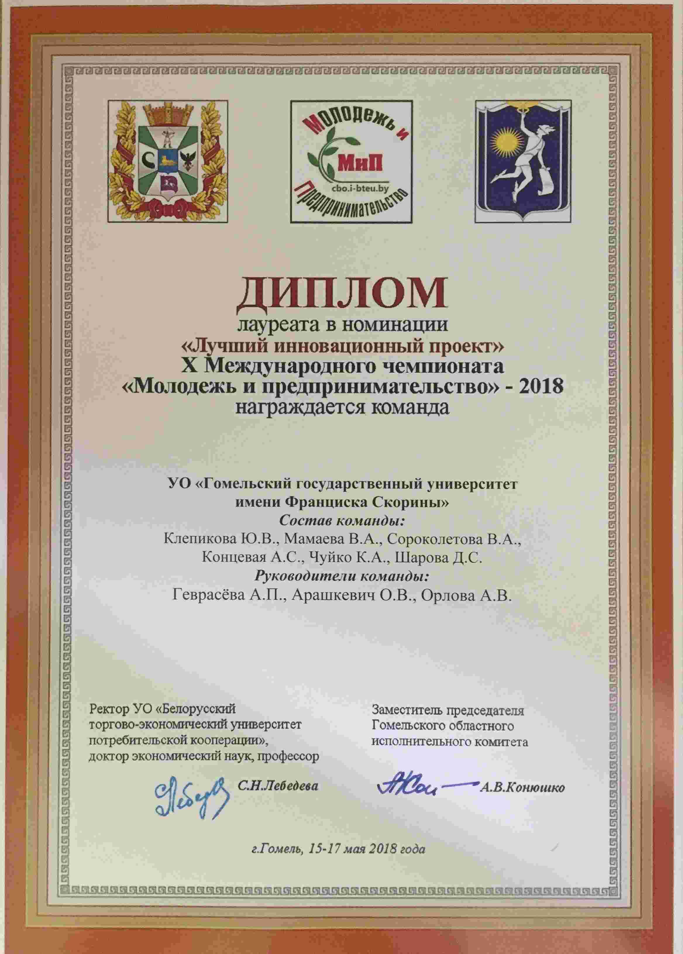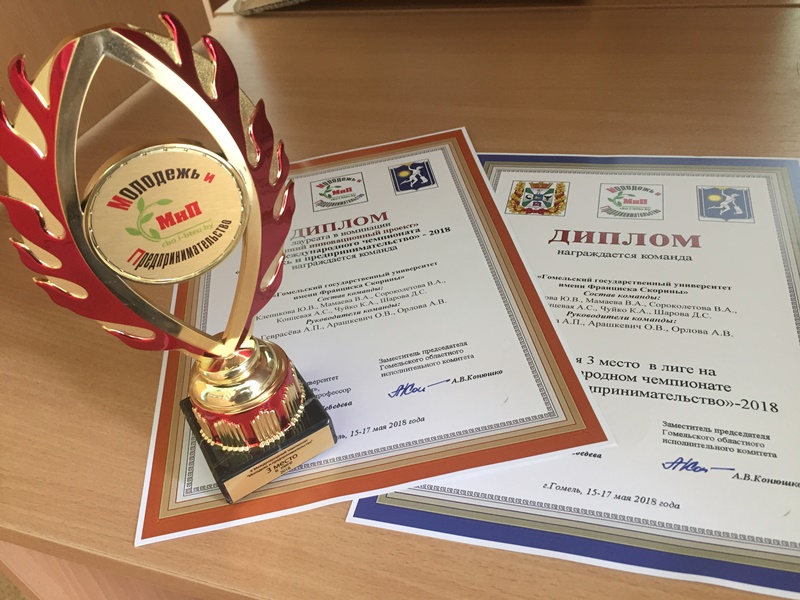 Поздравляем команду Гомельского государственного университета им. Ф. Скорины с успешным выступлением на X Международном чемпионате «Молодежь и предпринимательство — 2018». Команда в составе студенток 3 курса специальности «Экономика и управление на предприятии» Клепиковой Юлии, Мамаевой Виктории, Сороколетовой Виктории, Концевой Анастасии, Чуйковой Ксении, Шаровой Дарины удостоена диплома лауреата в номинации «Лучший инновационный проект».