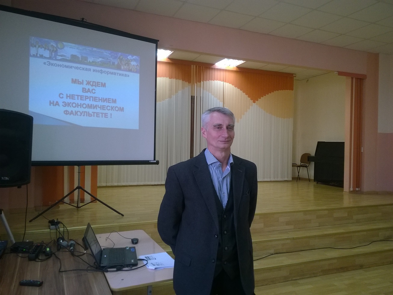 29 апреля старшие преподаватели кафедры экономической информатики, учета и коммерции Дорошев Д.В. и Шнып И.А. посетили среднюю школу № 11 г. Гомеля, где в актовом зале состоялась профориентационная встреча с 11-ми классами, среди которых были учащиеся физико-математического профиля.