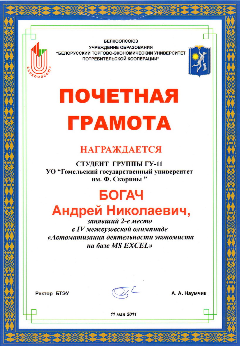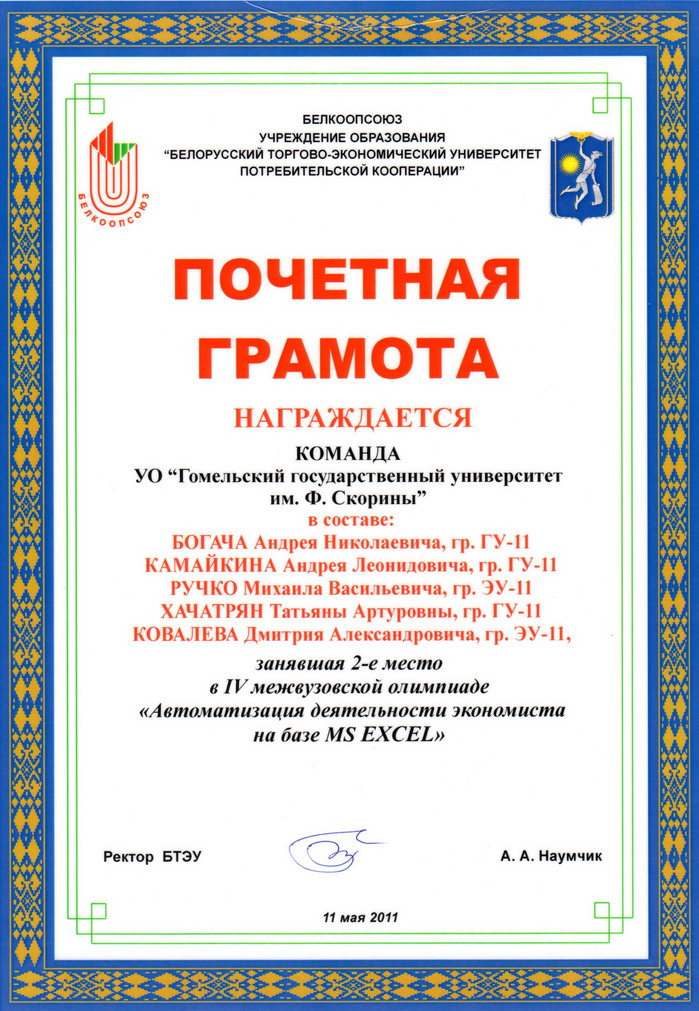 А достижения команды ГГУ, пусть звучит это немного нескромно, всё-таки высокие. В личном зачете Андрей Богач (ГУ-11) занял второе место, отстав от лидера (студента БТЭУ ПК Рабцевич Игоря) всего на 5 баллов. Кроме Андрея университет представляли ещё 4 человека: Камайкин А. (ГУ-11), студенты группы ЭУ-11 Ковалев Д., Ручко М. и Хачатрян Т., – получившие в командном зачете также серебро.
