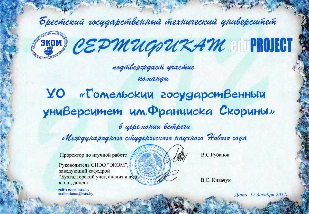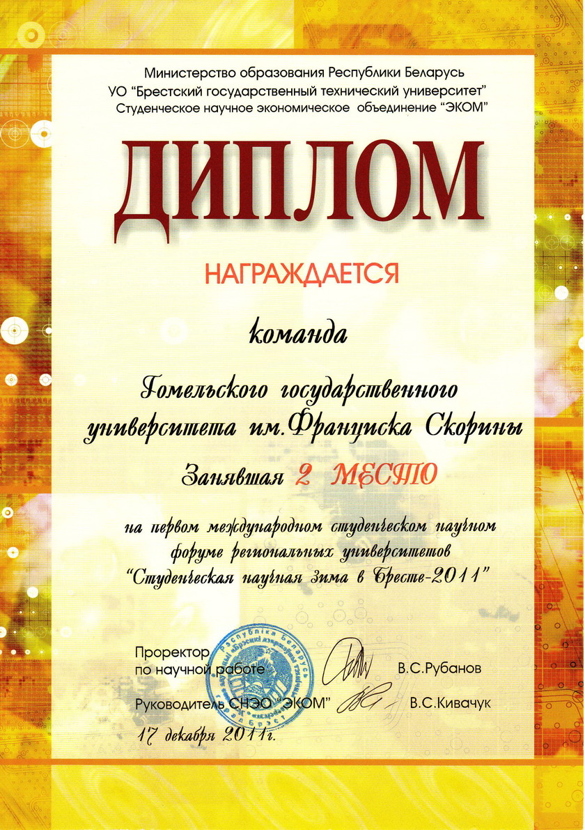 По итогам I международного студенческого научного форума региональных университетов «Студенческая научная зима в Бресте – 2011» команда Гомельского государственного университета им. Франциска Скорины была награждена дипломом за 2 общекомандное место.