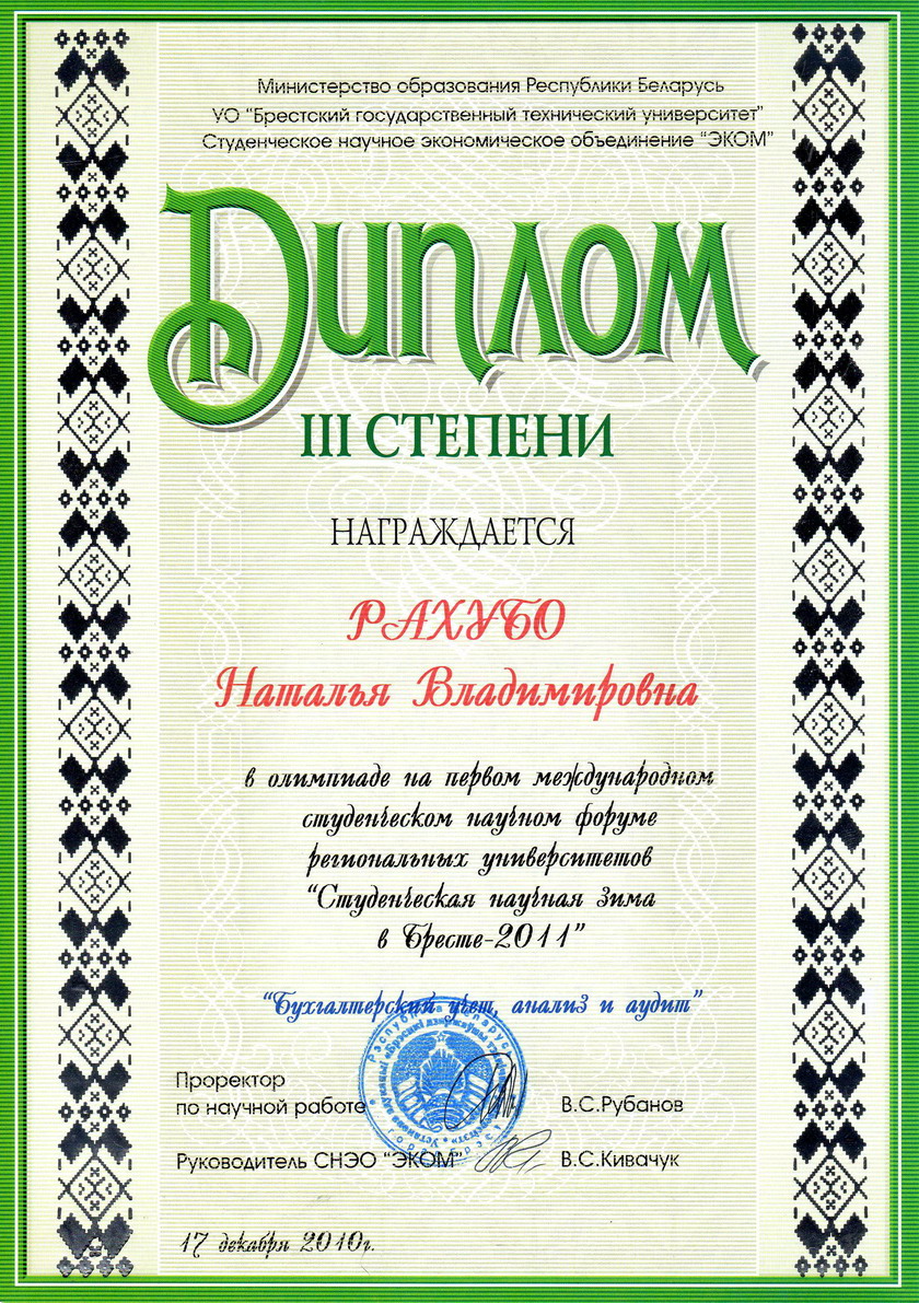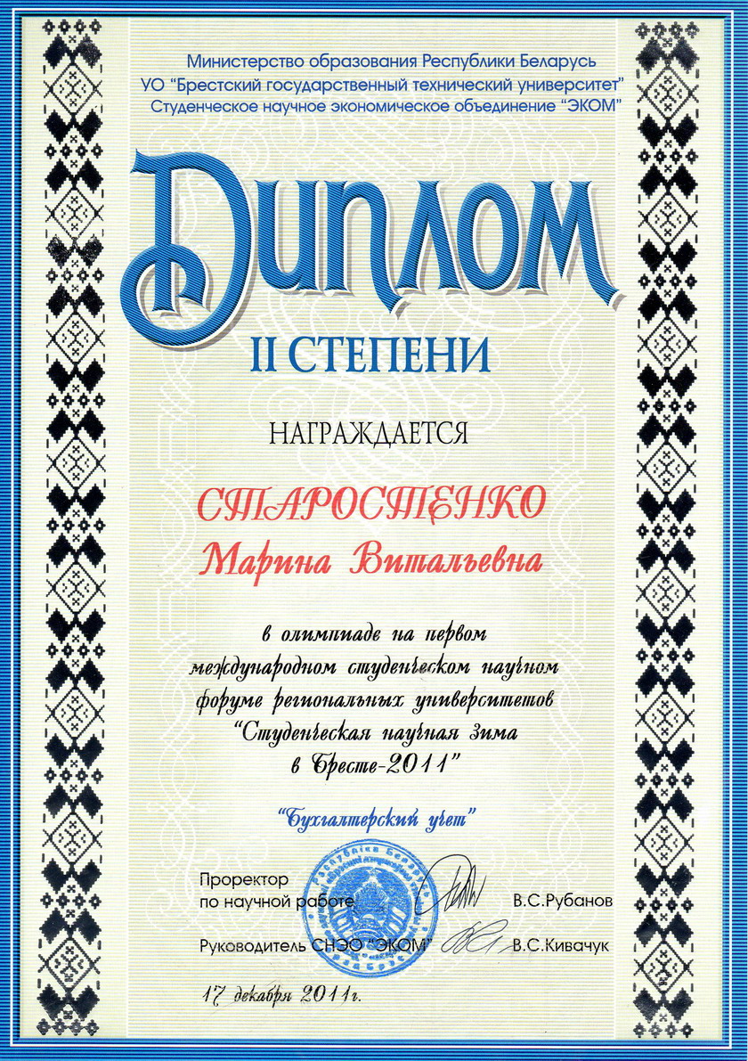 Студенческий научный форум проходил 15-17 декабря 2011 года. Организаторами данного мероприятия выступили: Министерство образования Республики Беларусь, УО «Брестский государственный технический университет», студенческое научное экономическое объединение «ЭКОМ».