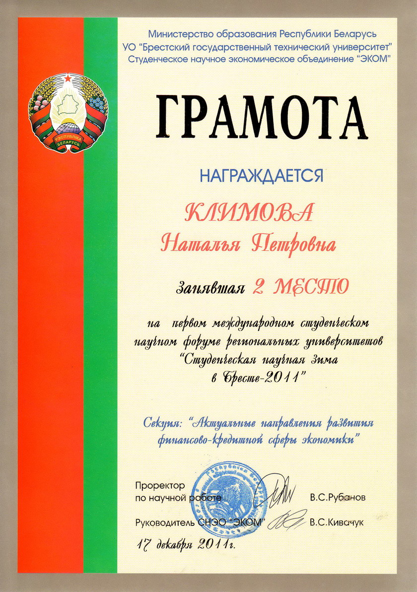 Представители экономического факультета ГГУ им. Франциска Скорины заняли II общекомандное место на I Международном студенческом научном форуме региональных университетов «Студенческая научная зима в Бресте -2011»